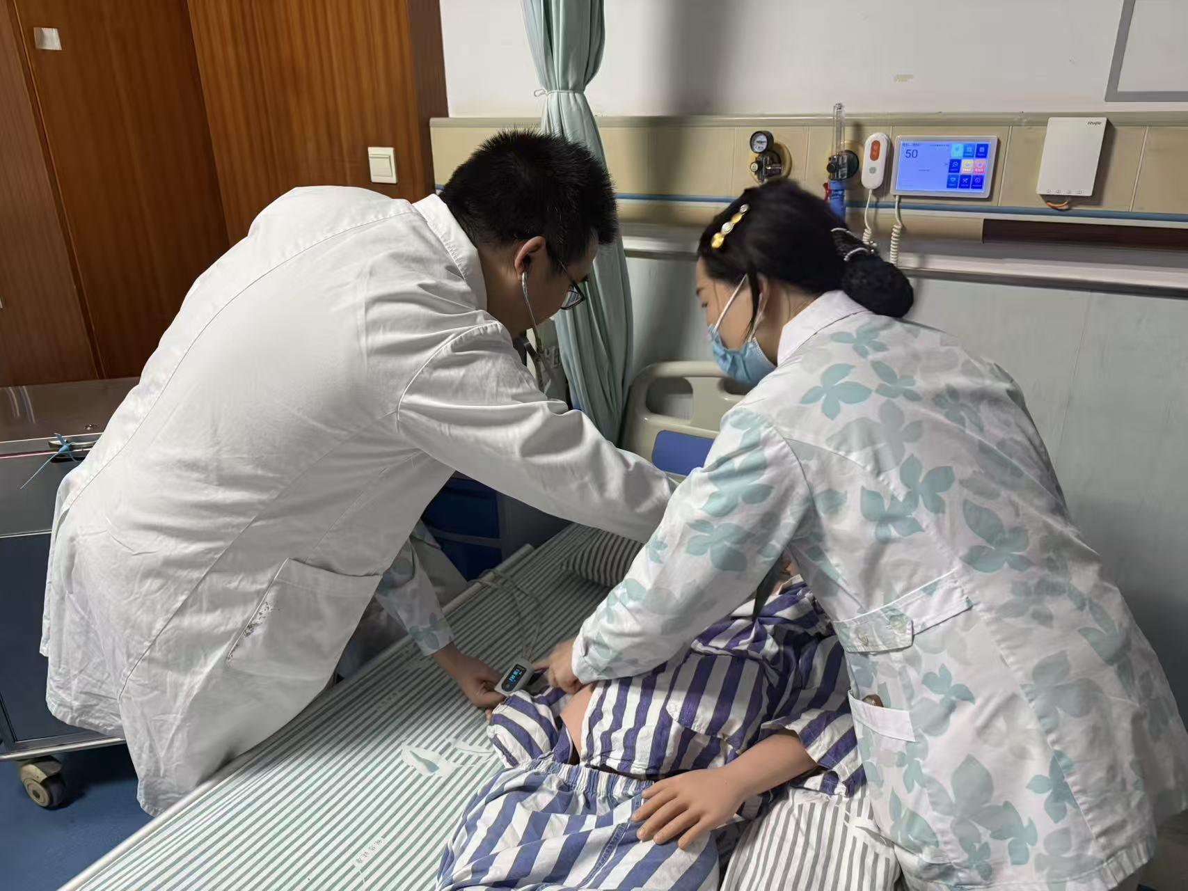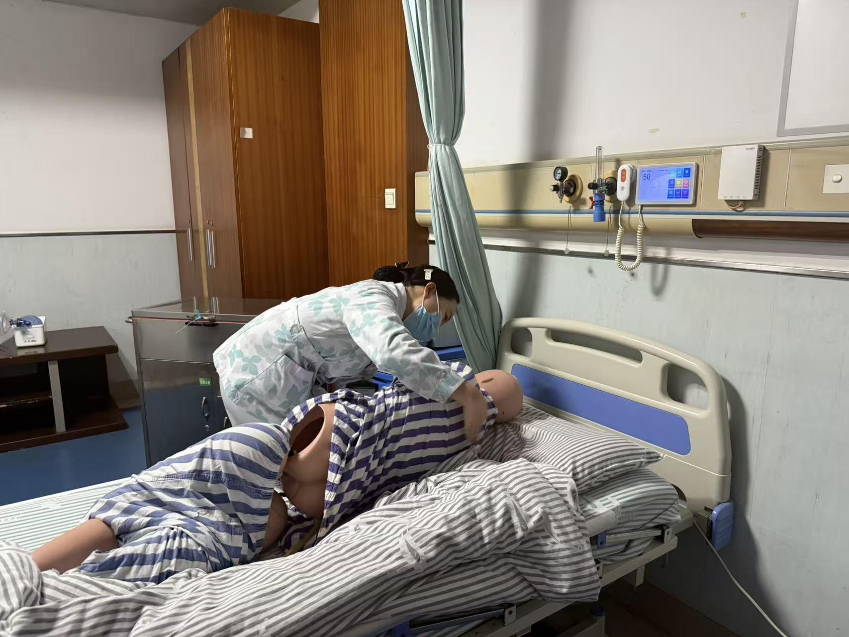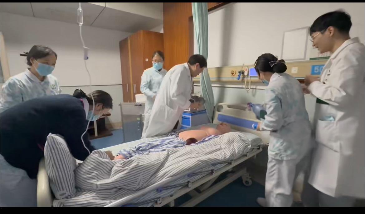 在患者突发窒息场景模拟中,护士杨XX接到家属呼救,立即床旁查看患者后,凭借敏锐的观察快速识别病情,立即调整患者卧位协助清除口腔,检查同时指定家属呼叫医生护士,医生张XX、陈XX及护士宋XX、周XX迅速携抢救车及吸痰装置到床旁,并通知呼吸科及麻醉科急会诊,最后在大家齐心协力下成功清除气道异物,患者逐渐恢复呼吸,面色转为红润。
