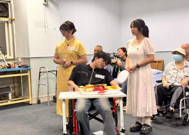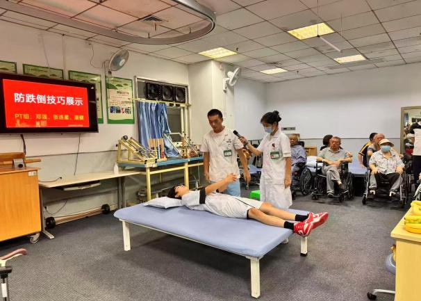 针对康复患者跌倒风险,带教老师从中医“筋骨并重”理论出发,讲解了平衡力与气血的关系。随后,实习同学们化身“安全大使”,进行了一场精彩的“防跌倒技巧展示”。他们不仅现场演示了如何利用家具安全起身、转身,以及如何选择合适的辅助工具,更创意展示了“不倒翁”式安全跌倒缓冲姿势,用直观、轻松的方式教会大家在意外发生时如何最大程度地保护自己,减少损伤。