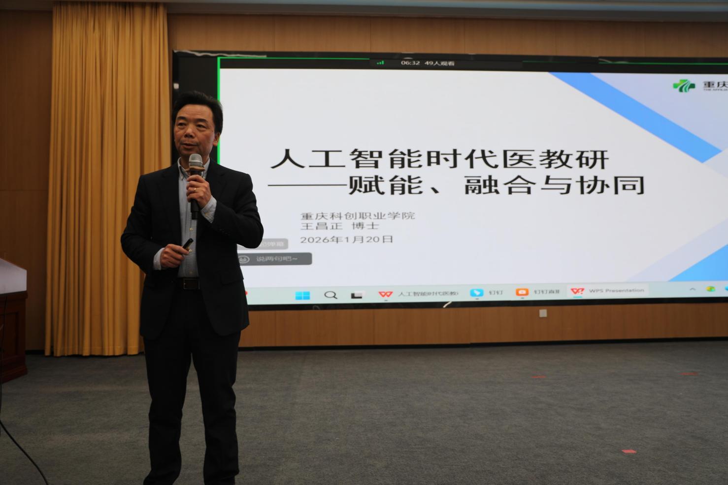 2026 年 1 月 20 日,我院举办“人工智能时代医教研:融合、赋能与协同”专题培训。工信部重点实验室工业大数据科教融汇创新中心(试点单位)主任。日本神户大学系统科学专业工学博士王昌正受邀主讲,其拥有超过 20 年在日本通产省图像情报科学研究所及美国硅谷高科技企业的前沿科研经历,目前聚焦通用人工智能跨领域研究。护理部副主任肖峰主持并致辞,强调要以二十届四中全会“深入推进数字中国建设”精神为指引,把握“人工智能+”行动机遇,推动医教研数字化转型。