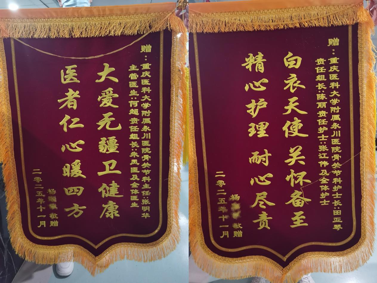 在骨关节科,锦旗并不罕见。但每一面锦旗背后,都承载着独特的生命故事。近日,患者杨先生为科室医护团队送来了两面锦旗,这不仅是一份赞誉,更是一段关于伤痛、专业与陪伴的见证。
