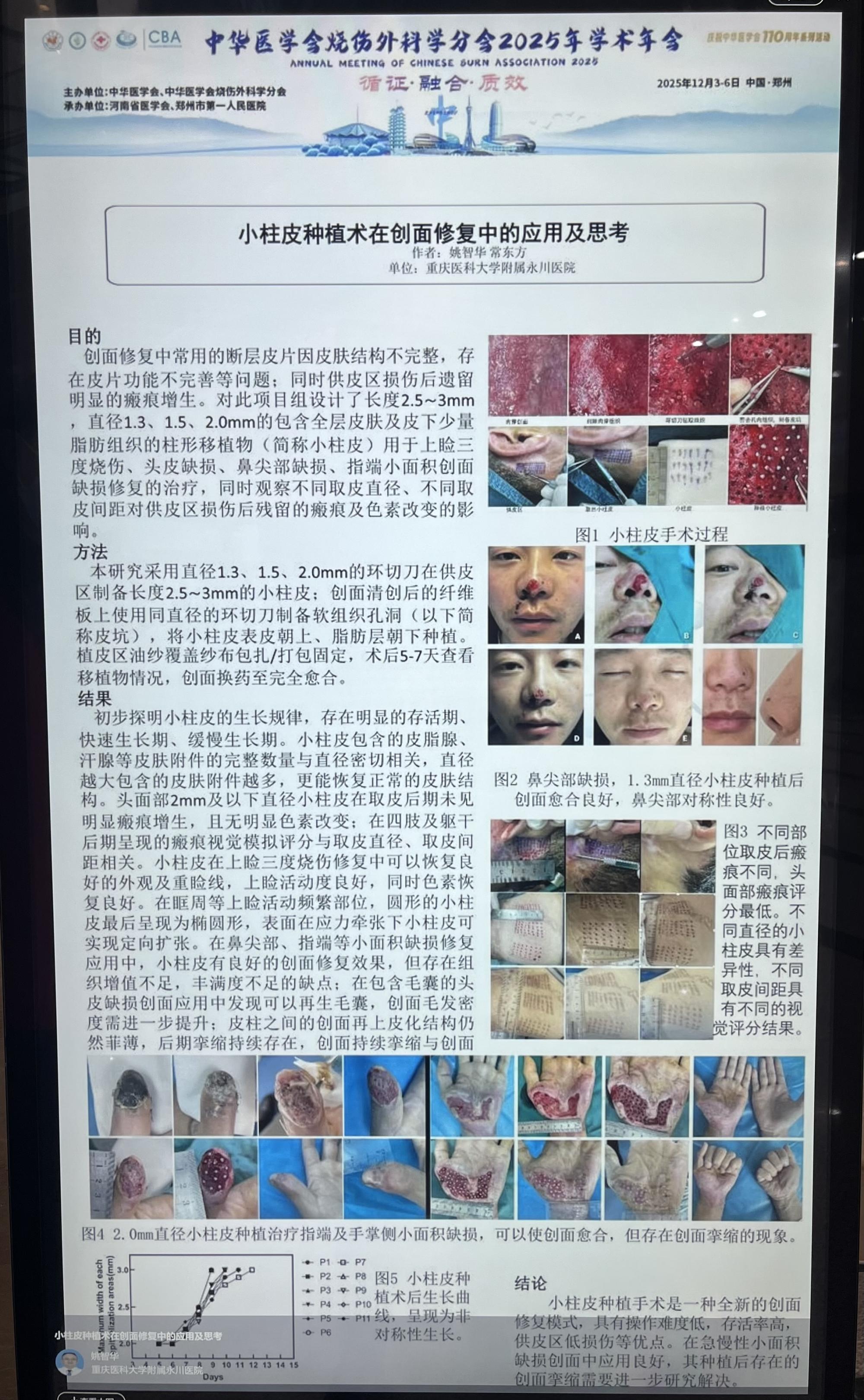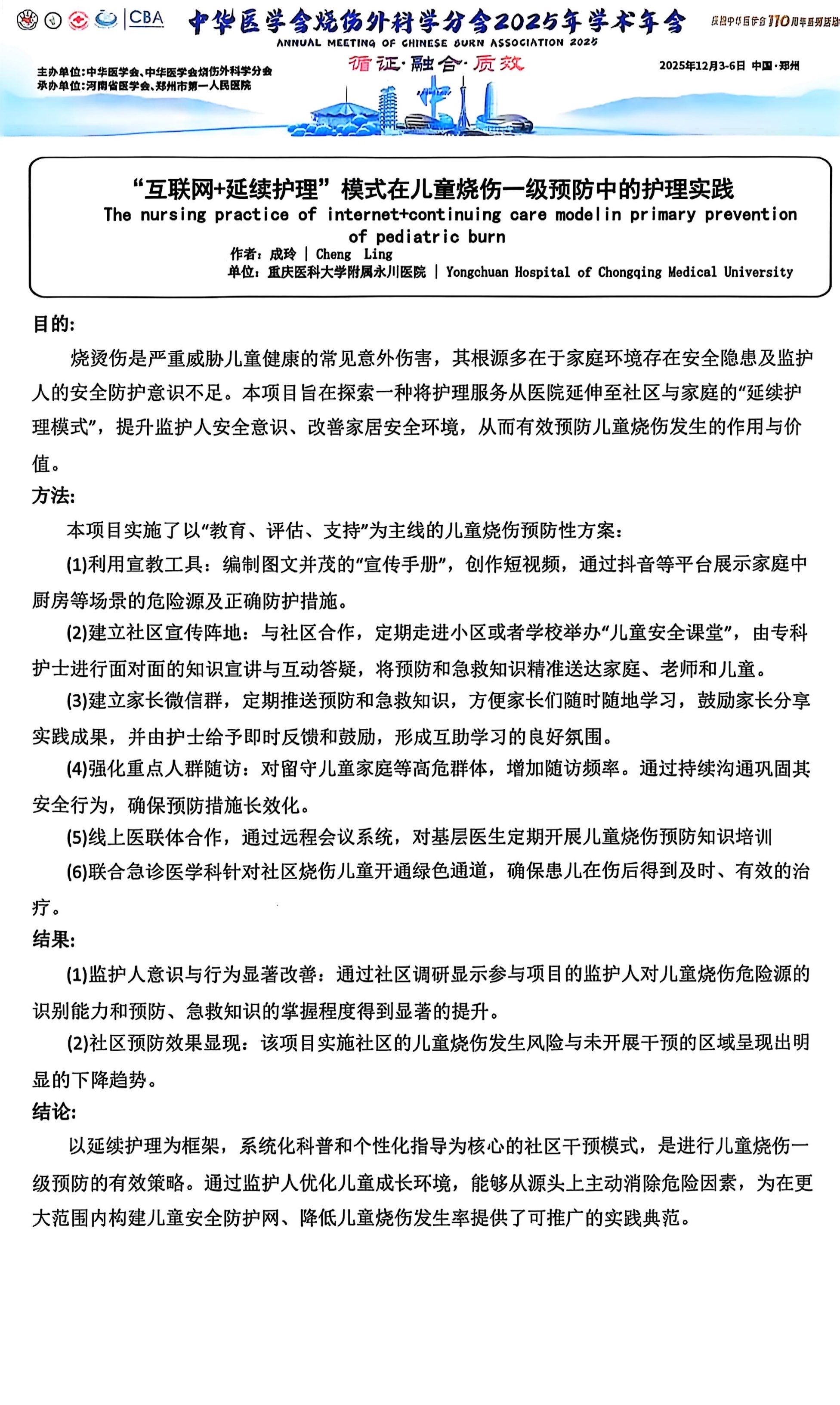 此次三篇论文的入选,不仅是对我院烧伤整形科在烧伤与创面修复领域持续深耕的认可,也充分体现了医护团队在临床研究、护理创新与社区健康促进中的积极探索。我院将以此次学术展示为契机,继续秉承“以患者为中心,以质量为根本”的服务理念,持续推进临床、科研与教学协同发展,为推动烧伤与创面修复领域的进步贡献更多的力量。