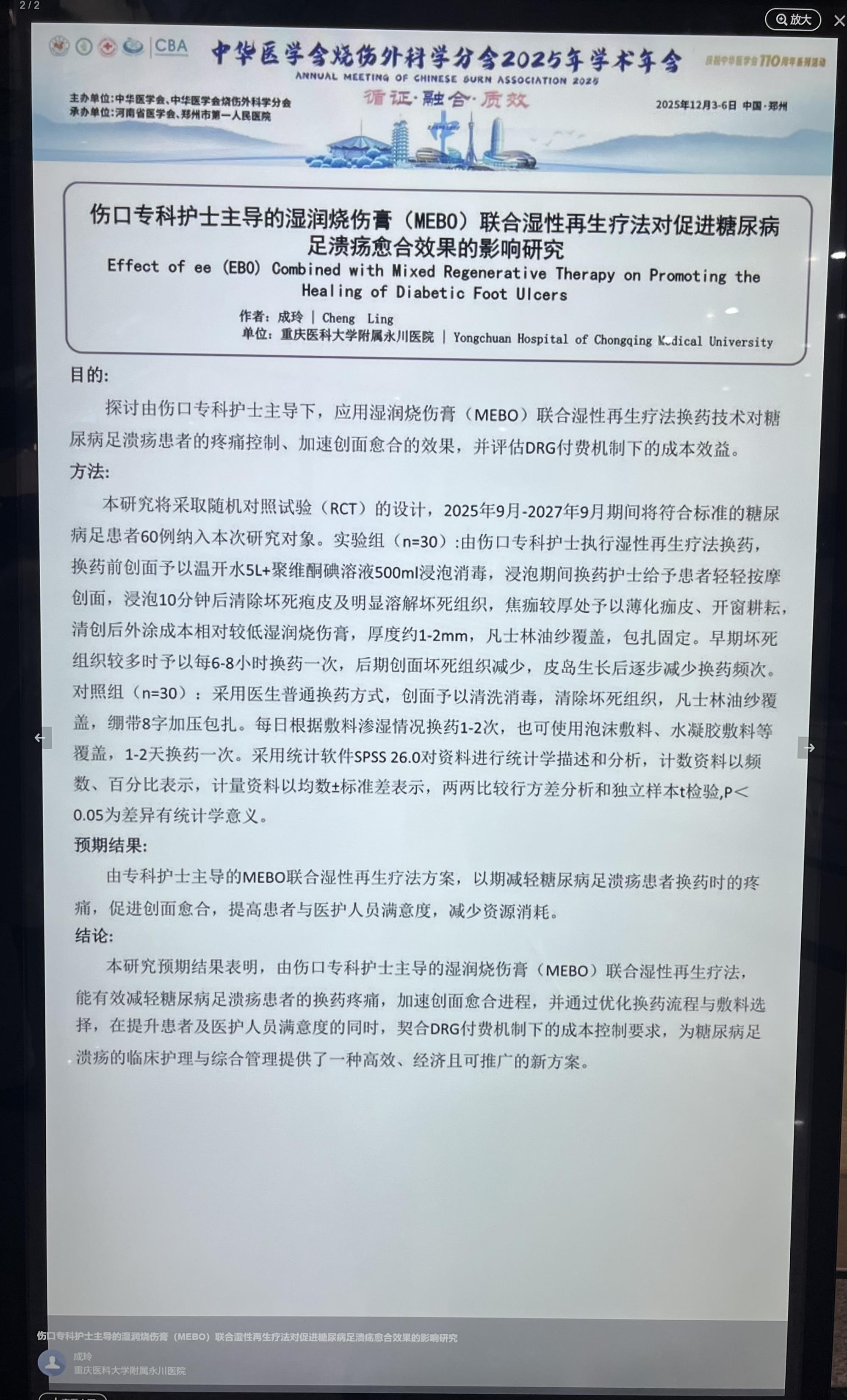 《伤口专科护士主导的湿润烧伤膏(MEBO)联合湿性再生疗法对促进糖尿病足溃疡愈合效果的影响研究》是由伤口专科护士主导的联合治疗方案,该方案可有效减轻患者换药疼痛,促进创面愈合,同时优化护理流程,契合当前医疗成本控制要求,为糖尿病足溃疡管理提供高效、经济的护理路径。