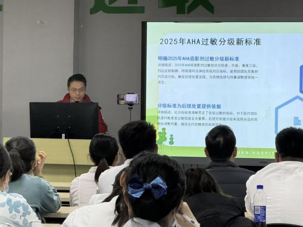 为进一步提升急救理论水平,12月18日下午,科室特邀急诊科喻依川主任进行专题讲座,讲座围绕过敏分级与预警、一线抢救流程、肾上腺素全程应用、辅助药物配伍四个方面为全员传授对比剂过敏抢救与用药要点。讲座结束后,全科人员通过线上方式完成了理论考核,进一步巩固与深化了学习成果。