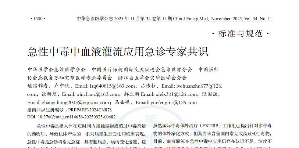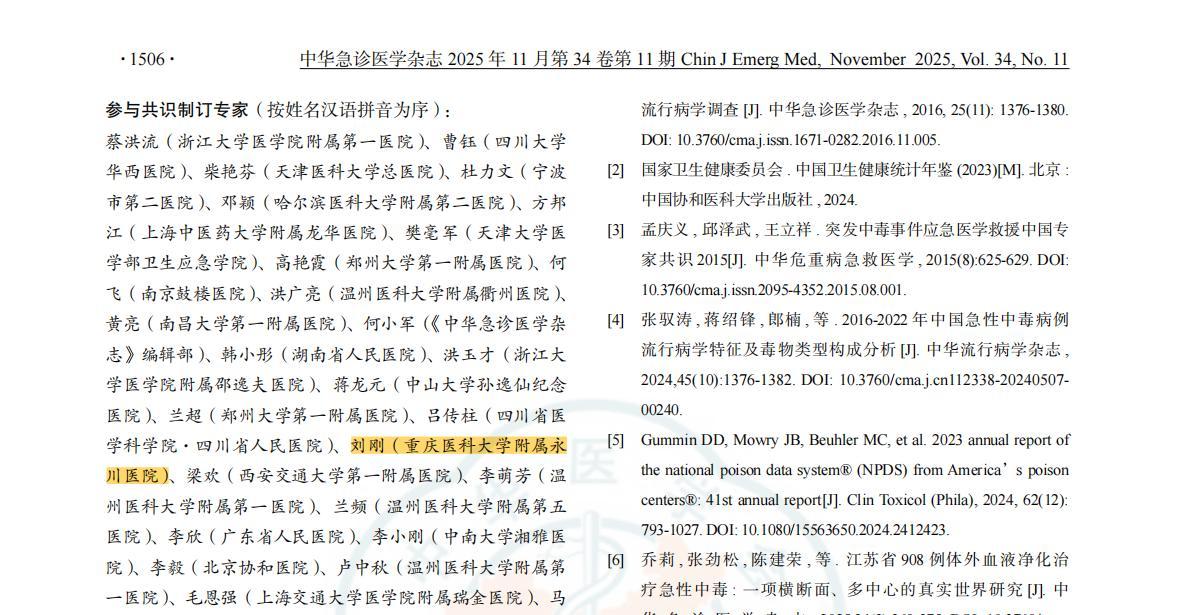 近日,由中华医学会急诊医学分会等多家权威学术组织联合制定的《急性中毒中血液灌流应用急诊专家共识》在中华急诊医学杂志2025年11月第34卷第11期正式发布。重庆医科大学附属永川医院主任医师、博士生导师刘刚教授作为知名急危重症救治专家,受邀参与本共识的制订工作,为我国急性中毒血液灌流治疗的规范化、科学化发展贡献了重要力量。
