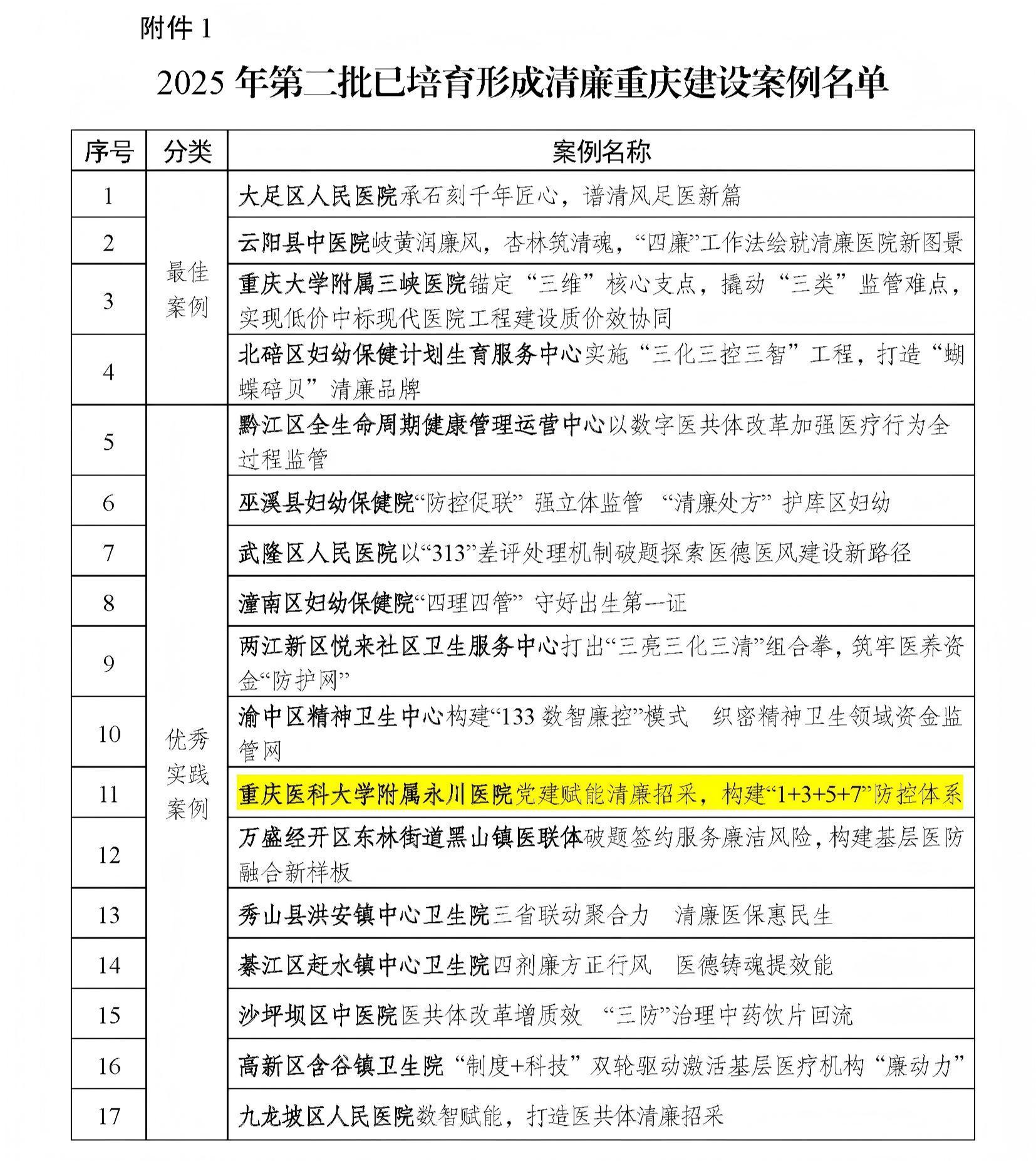 近日,重庆市医院党建工作指导委员会办公室印发通知,公布2025年第二批清廉重庆建设优秀实践案例名单。我院设备科申报的《党建赋能清廉招采,构建“1+3+5+7”防控体系》案例成功入选,标志着科室在清廉医院建设,特别是招采领域风险防控方面的创新实践获得市级认可。
