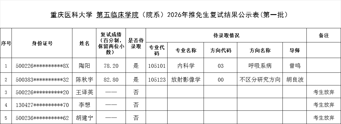 重庆医科大学第五临床学院2026年推免生第一批复试结果公示