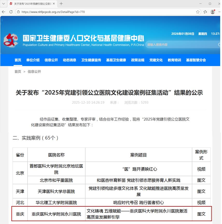 近日,国家卫生健康委人口文化与基层健康中心发布了“2025年党建引领公立医院文化建设案例征集活动”的评选结果。我院党委申报的《文化铸魂 五维赋能——重庆医科大学附属永川医院激活高质量发展新引擎》,成功入选“实践案例”。在此次评选中,全国仅65家医院获此殊荣,我院成功跻身其中!