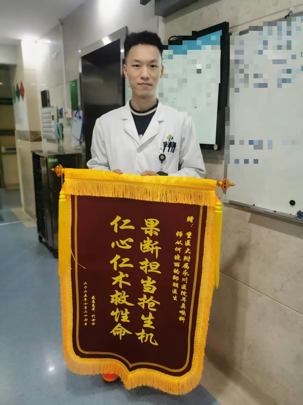 “多亏了邹医生当时沉着冷静的处理和耐心细致的安慰,不然我真不知道该怎么办!”近日,一面印着“果断担当抢生机、仁心仁术救性命”的锦旗被郑重送到我院耳鼻咽喉科住培专业基地,患者代女士(化名)怀抱锦旗来到2号楼10楼,再三表达感激之情。这面锦旗的背后,是一段关于责任、专业与温情的医患故事。