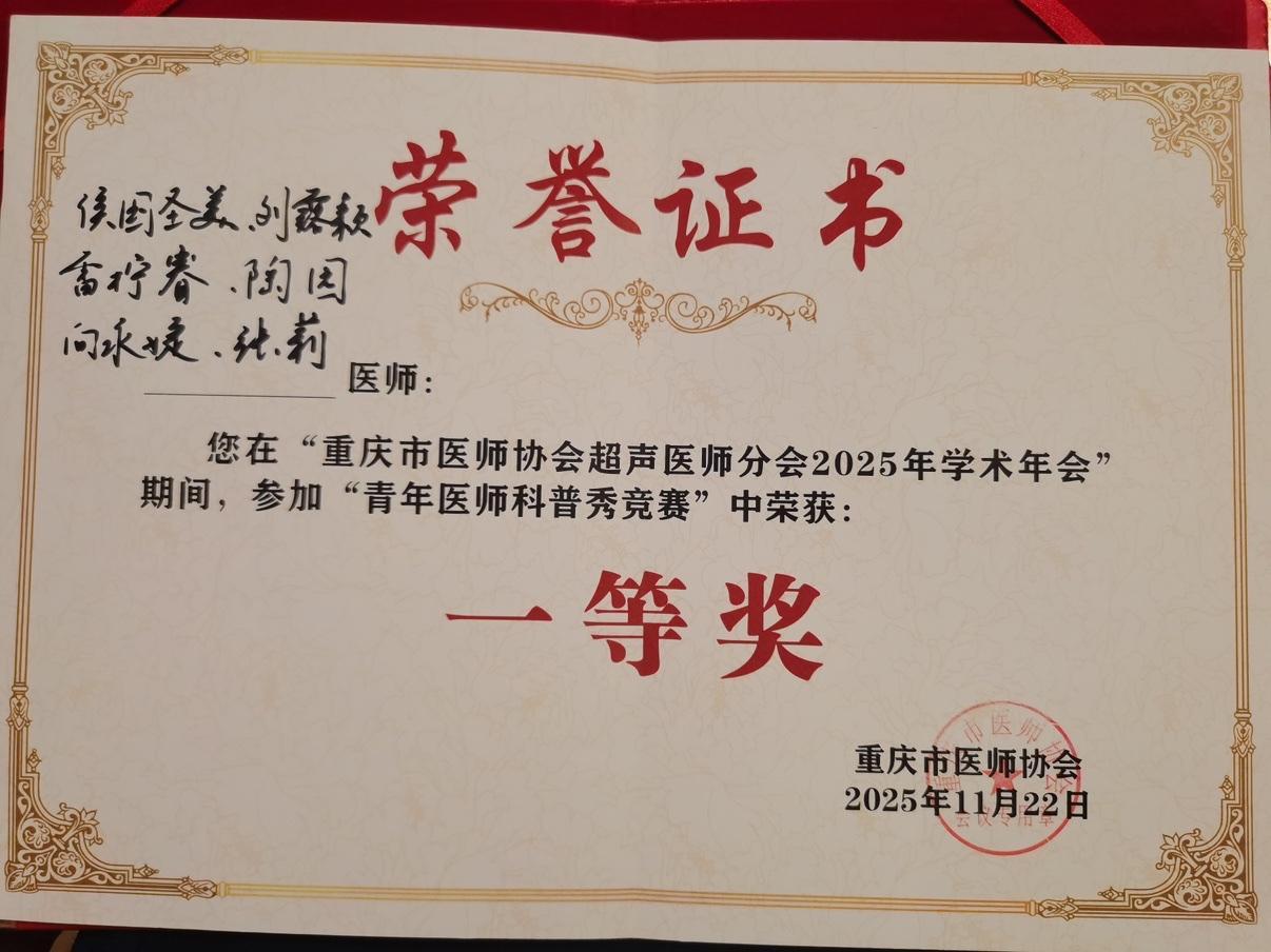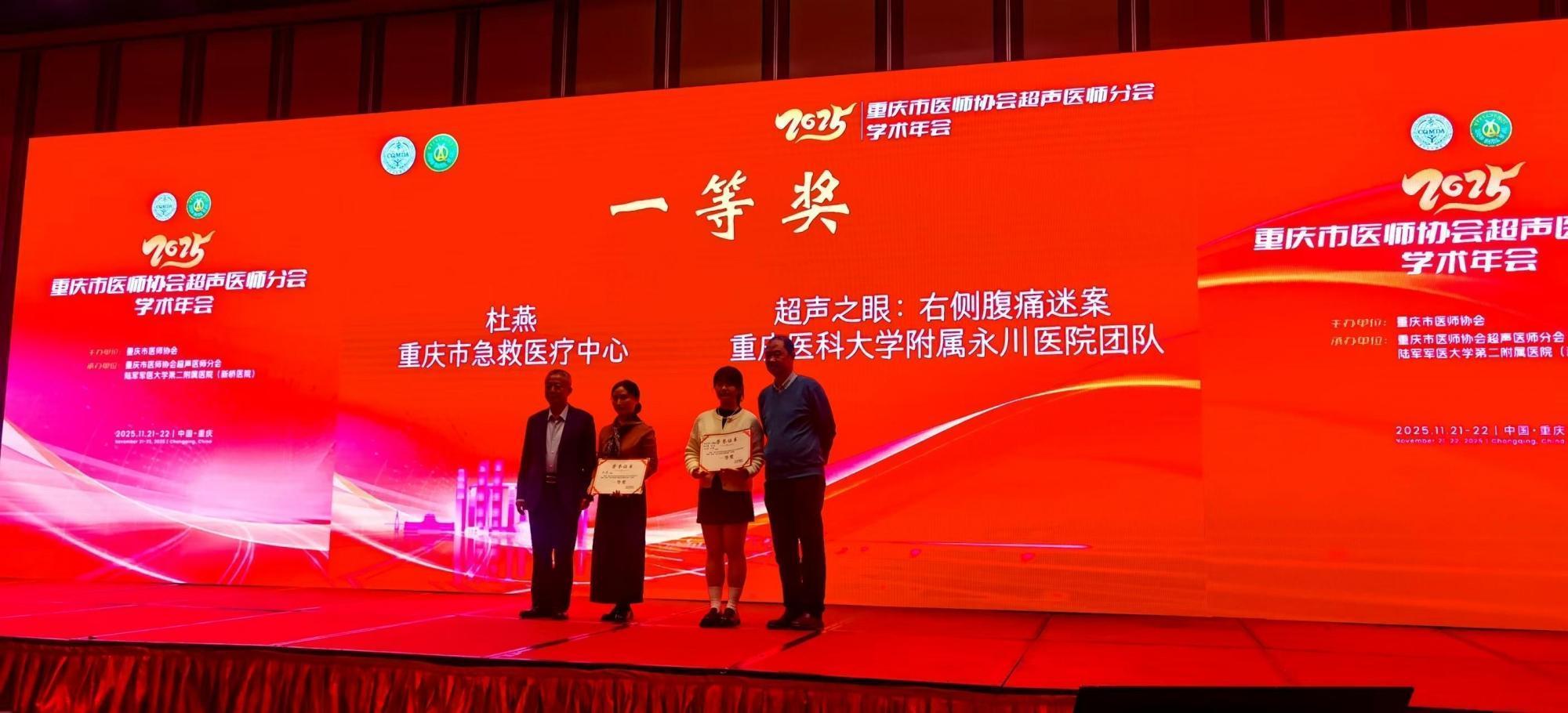 2025年11月22日,在重庆市医师协会主办的重庆市医师协会超声医师分会学术年会青年医师科普秀竞赛中,我院超声医学科住培团队在张东竹、刘学主任的带领下,以“超声之眼:右侧腹痛迷案”为主题,凭借专业的知识储备、精彩的科普演绎和默契的团队协作,从众多参赛队伍中脱颖而出,以总分第一名的优异成绩荣获一等奖,充分展现了我院超声医学科住培基地的教学成果与青年医师的蓬勃风采。